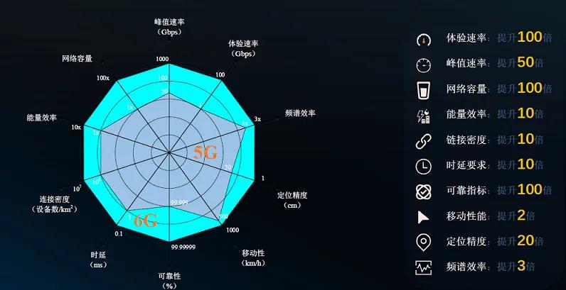 5G作為4G的延伸,也具有明顯的高速率,低時(shí)延、大容量等特征,例如:傳輸速度可達(dá)20Gbps;時(shí)延低至1ms;5G室內(nèi)定位精度3.5GHz頻段下在5m左右,毫米波定位精度可以達(dá)到3m……但6G與之相較,優(yōu)勢更為突出。